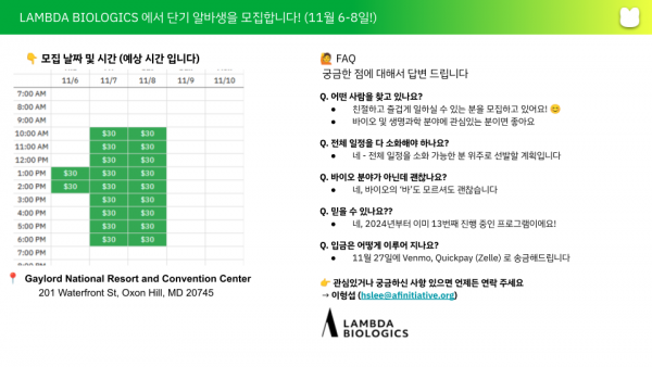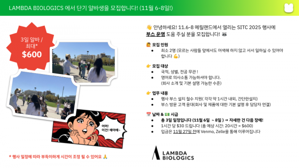11월 6일 - 8일 (총 3일) Gaylord National Resort and Convention Center, 201 Waterfront St, Oxon Hill, MD 20745 에서 열리는 SITC 2025 학회에서 부스 운영에 도움 실 분을 모집합니다!