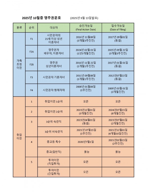 2025년 10월의 영주권 문호에서 시민권자의 21세이상 성년미혼자녀들이 대상인 가족이민 1순위는 승인가능일 (Final Action Date) 이 2016년 11월 08일로 3개월 3주 진전 되었으며, 접수가능일 (Filing Date)은 2017년 9월 1일로 동결 되었습니다.